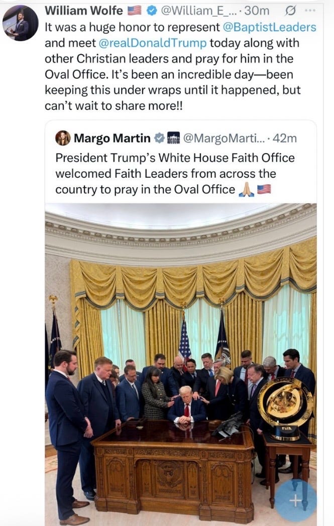 There is no evidence of true personal morality affecting their approach to politics at all, because for Christian Nationalists, the ends always seem to justify the means. How else could William Wolfe brag about praying for Trump under the spiritual headship of a (female) heretic?