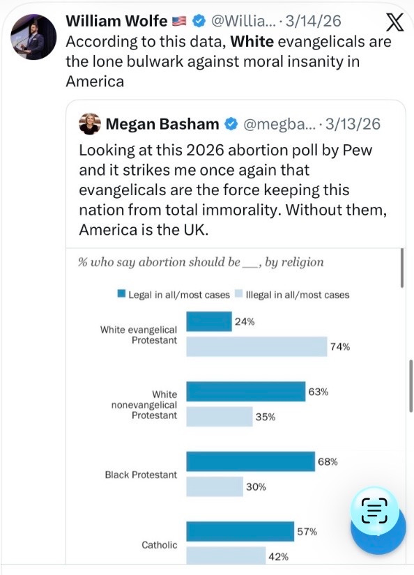 A strong majority of white evangelicals are pro-fornication, Christian Nationalists. Exactly how does that square with a) Scripture and b) your unsubstantiated claim that white evangelicals are the “lone bulwark against moral insanity in America?”