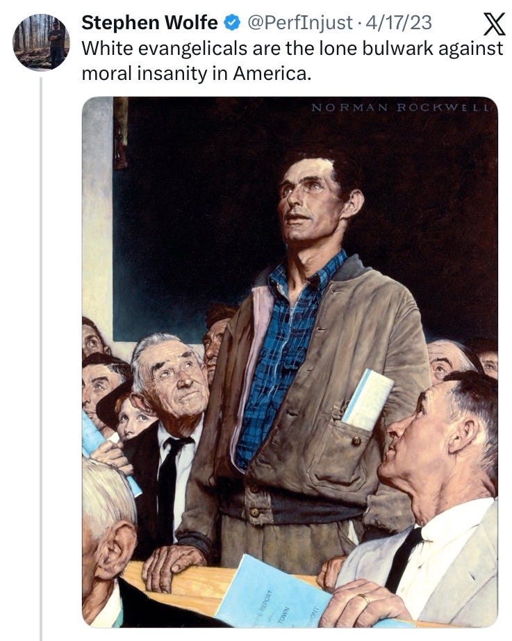 All of this is why, as dumb as the “Eleven Words” were back in 2023, they sound even dumber now. Two years after Stephen Wolfe wrote those incomprehensibly dumb words, we know much more about the moral character of the people who are trumpeting this ludicrous sentence, as well as the relevant data about the very immoral state of today’s American evangelicals.