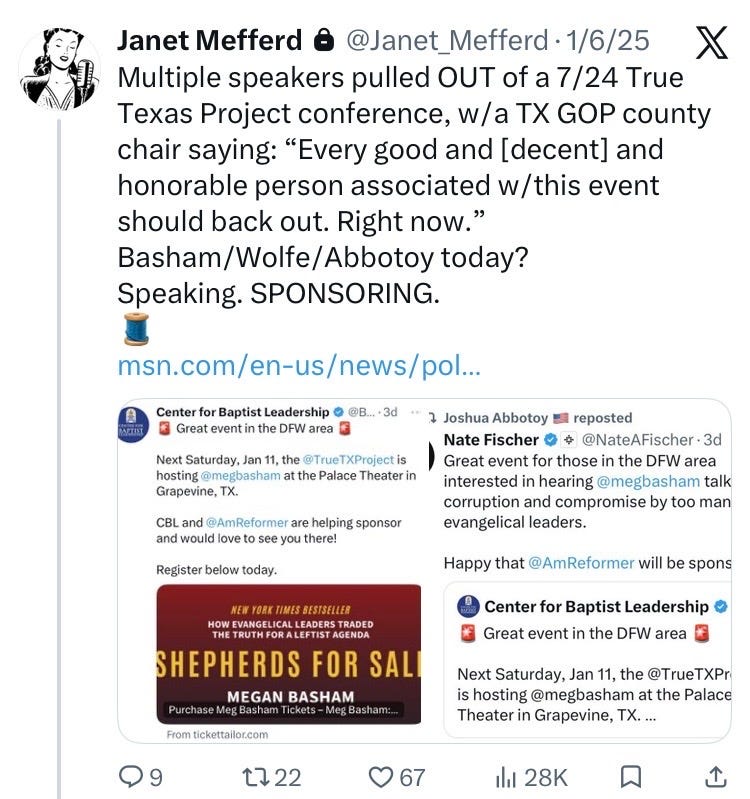 Now the Daily Wire’s Megan Basham and American Reformer’s William Wolfe, executive director of AmRef’s “assumed name,” the Center for Baptist Leadership, are publicly echoing him. Here’s what they recently posted :