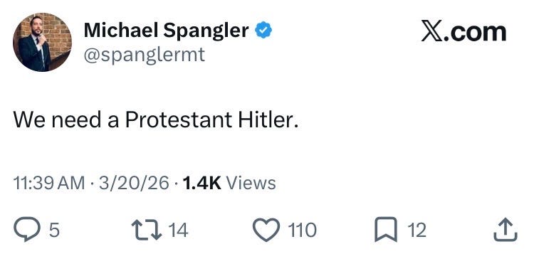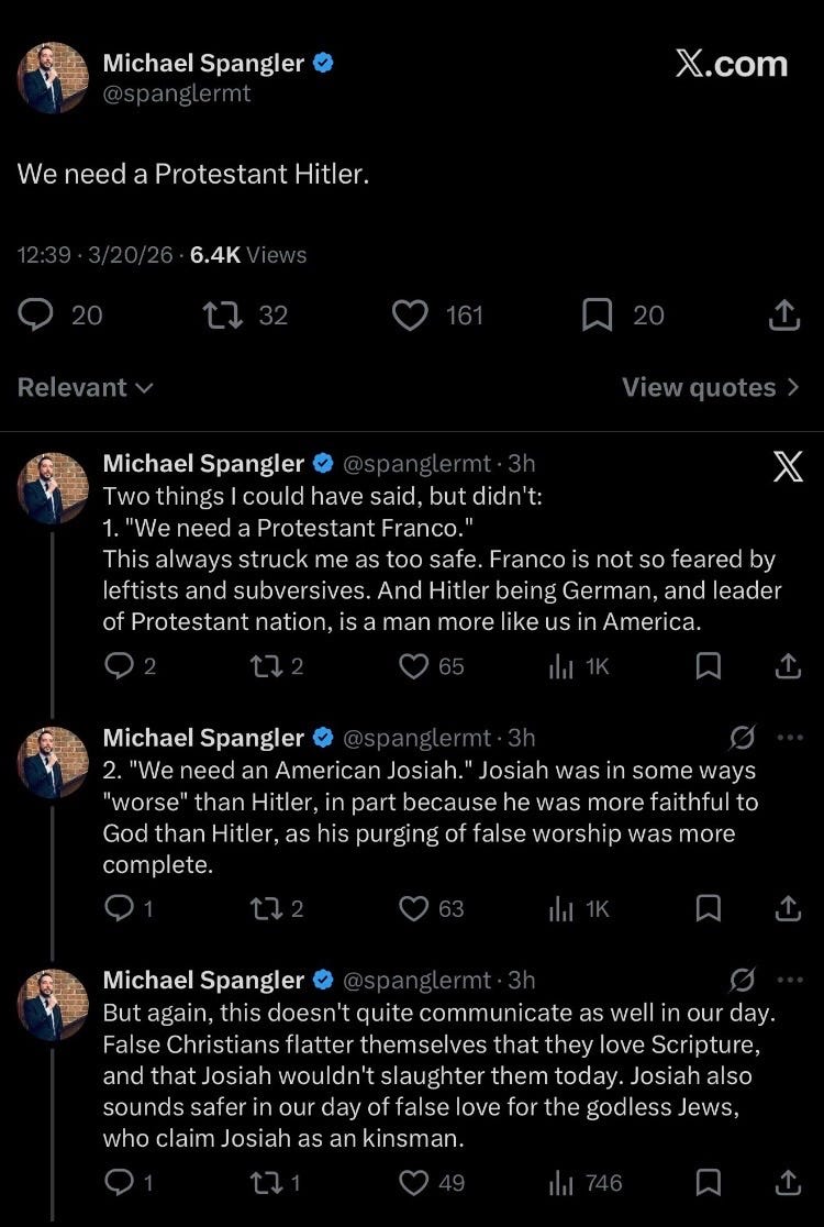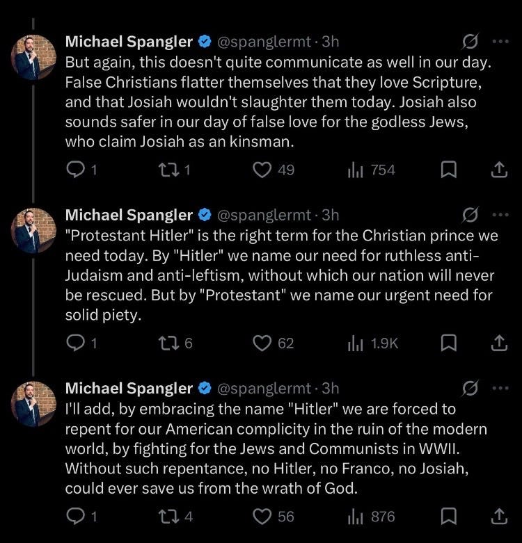 And a week to the day later, Michael Spangler, who was divested from his role as a minister in the Orthodox Presbyterian Church in 2024, basically became the first figure of note in the Woke Right Christian Nationalist movement to finally go there on X: